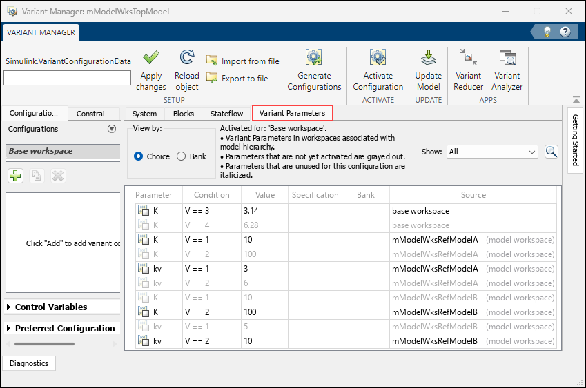 corresponding workspace. For information on managing variant parameters, see Manage Variant Parameters Using Variant Manager.