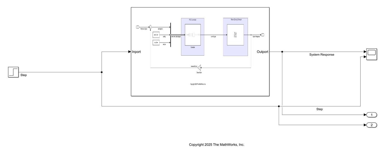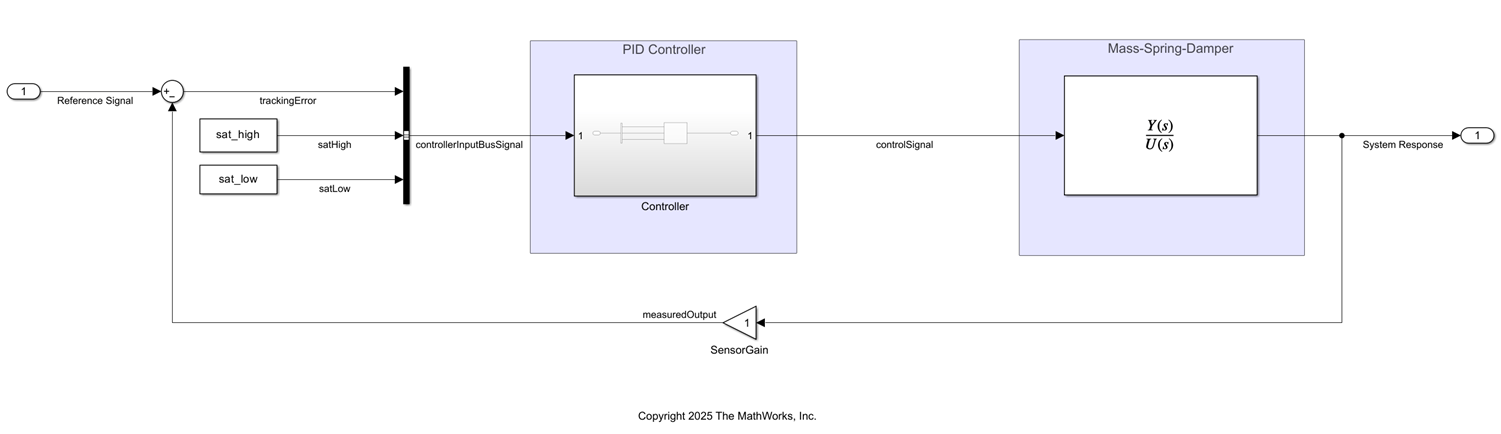 Open the massSpringDamperPIDTunableParams model. This model contains a PID controller that controls the position of a mass in a mass-spring-damper system.