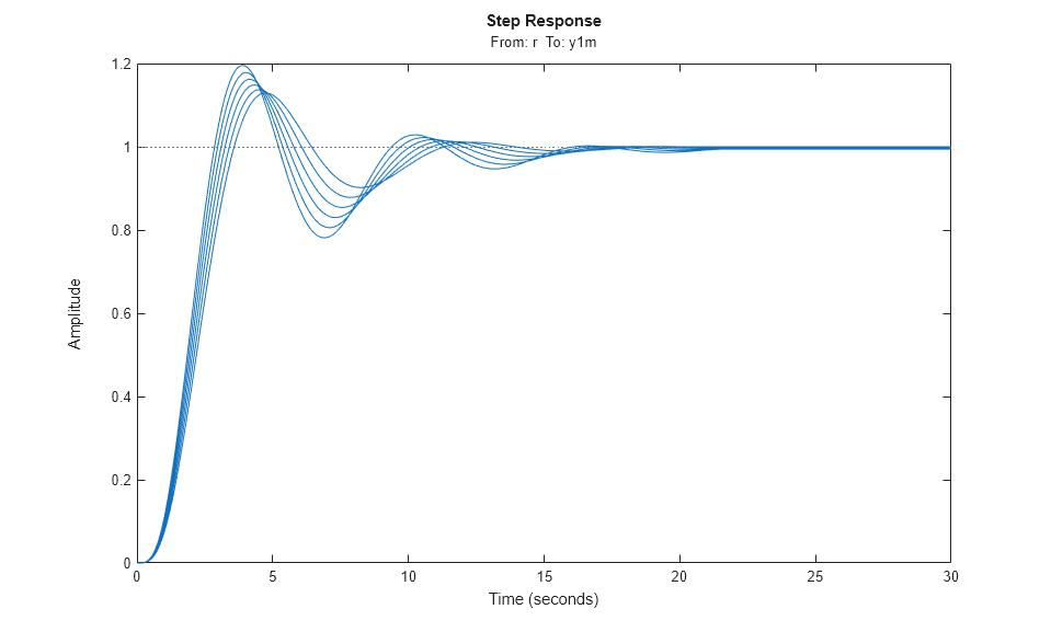 ゲイン値の変化による影響を調べるには、G の線形化されたモデルを解析します。たとえば、Kp2 のすべての値と Ki1 の 3 番目の値でのステップ応答を調べます。