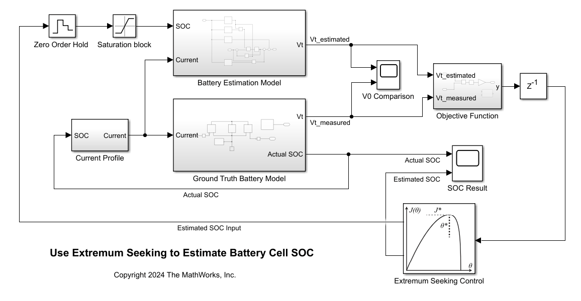 This example shows how to construct a virtual sensor for a battery cell state of charge (SOC) using Extremum Seeking Control (ESC). In this example, you use ESC for parameter estimation instead of controlling the plant. Extremum seeking control provides a unique data-driven approach to construct a virtual sensor, different from all existing techniques. This virtual sensor application showcases the versatility of ESC as a data-driven approach for parameter estimation.