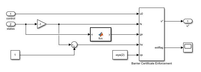 Barrier Certificate Enforcement ブロックは形式 のプラント ダイナミクスを受け入れます。このアプリケーションの場合、 および となります。
