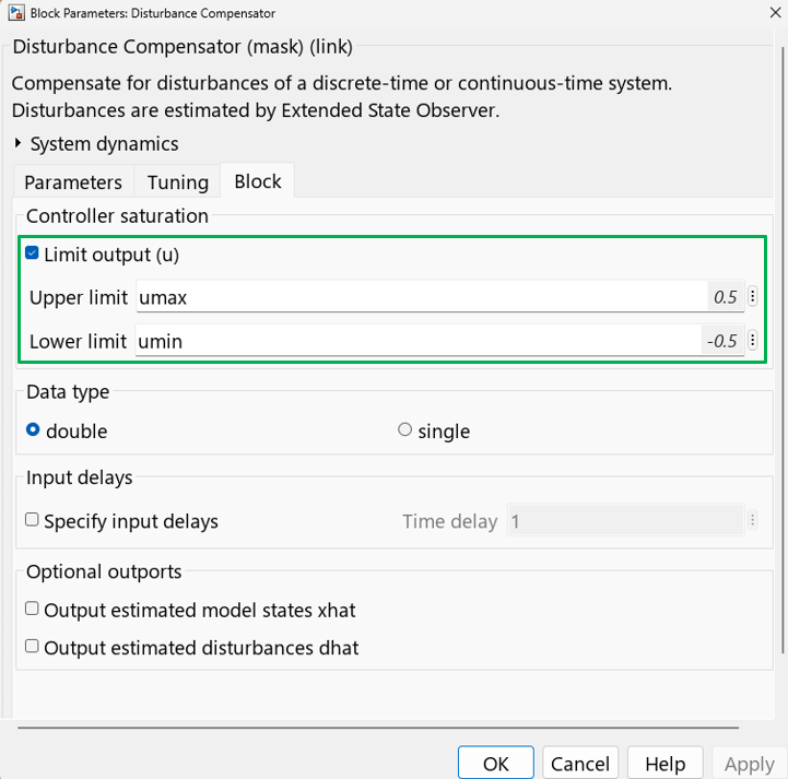 Specify the controller limits for the "Disturbance Compensator" block.