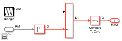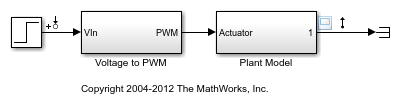 scdpwm モデルには、PWM 信号をモデル化してからプラント モデルに入る Voltage to PWM サブシステムがあります。