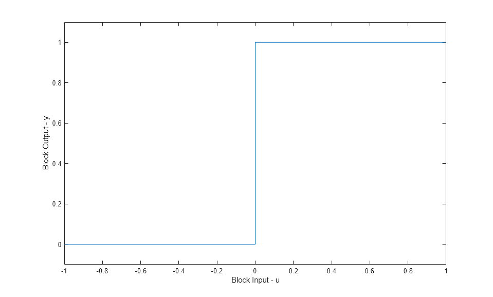 u = [-1:0.1:0,0:0.1:1]; y = [zeros(11,1);ones(11,1)]; plot(u,y) xlabel('Block Input - u') ylabel('Block Output - y') ylim([-0.1 1.1])