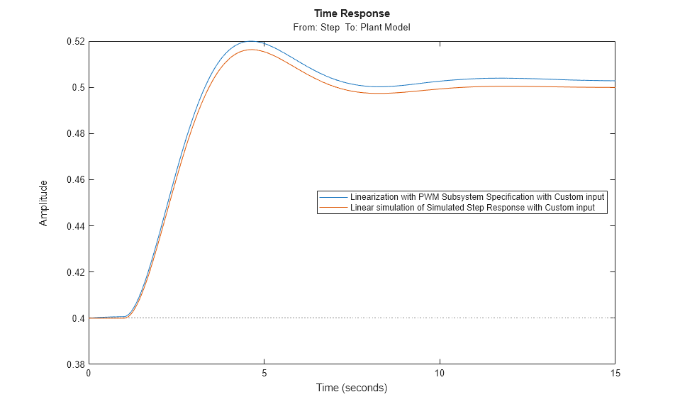 Voltage to PWM サブシステムに指定した線形化は線形化にのみ影響し、モデルのシミュレーションには影響しません。そのため、周波数応答を推定する前に線形化の指定を削除する必要はありません。