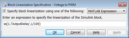 set_param(pwmblk,'SCDEnableBlockLinearizationSpecification','on'); rep = struct('Specification','ss(1,''OutputDelay'',1/100)',... 'Type','Expression',... 'ParameterNames','',... 'ParameterValues',''); set_param(pwmblk,'SCDBlockLinearizationSpecification',rep);