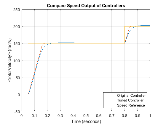 コントローラーを調整する前に、元のコントローラーでの速度応答を確認し、シミュレーション結果を MAT ファイル SystunedSpeed.mat に保存します。既存の速度の PI コントローラーのゲインは P = 0.08655 および I = 0.1997 です。電流の PI コントローラーのゲインはどちらも P = 1 および I = 200 です。