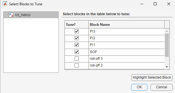 制御システム調整器の [調整] タブで、[ブロックの選択] をクリックします。[調整ブロックの選択] ダイアログを使用して、調整するブロックを指定します。
