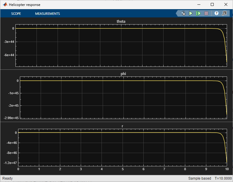 そのためには、調整されたパラメーター値を Simulink モデルに書き込み直します。[Control System] タブで、[ブロックの更新] をクリックします。Simulink モデル ウィンドウで、新しいパラメーター値を使ってモデルをシミュレートします。それぞれ 0 秒、3 秒、および 6 秒における設定点コマンド theta-ref、phi-ref、r-ref でのステップの変更に対する応答を確認します。