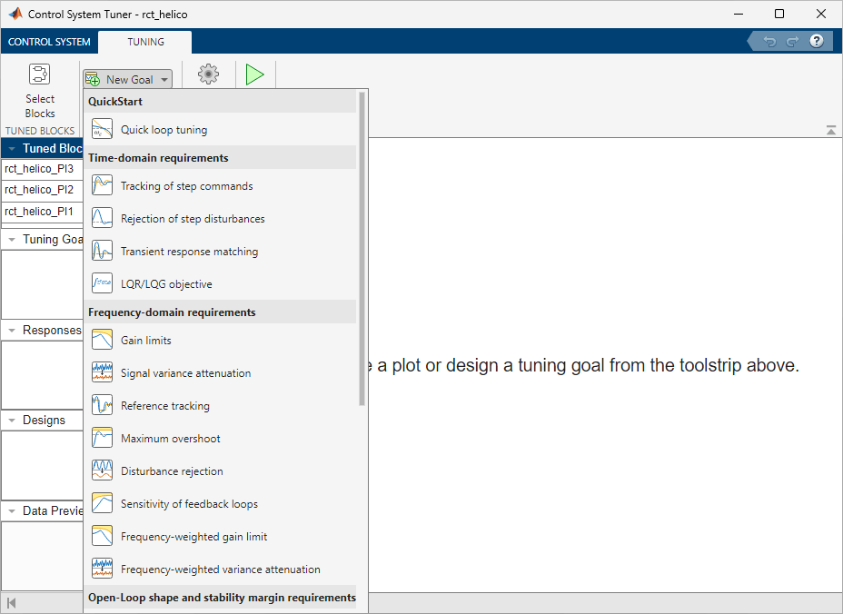 前に説明したように、このシステムの設計要件には、設定点の追従、最小の安定余裕および高速ダイナミクスの制限が含まれます。制御システム調整器で、"調整目標" を使用して設計要件を取得します。