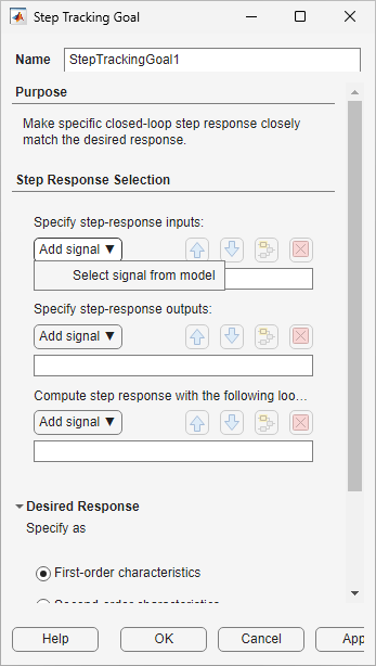 [ステップ追従目標] ダイアログで、追従する基準信号を指定します。[ステップ応答入力の指定] で、[信号をリストに追加] をクリックします。次に、[モデルから信号を選択] をクリックします。