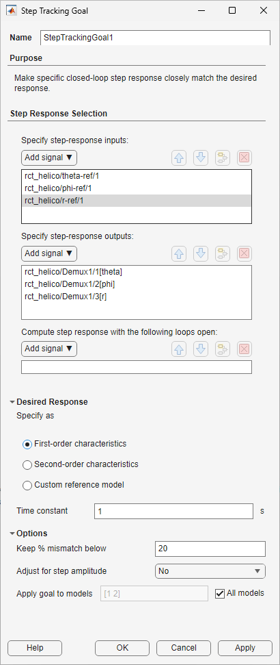 Simulink モデル エディターで、基準信号 theta_ref、phi_ref、および r_ref を選択します。これらの信号が [信号の選択] ダイアログ ボックスに表示されます。[信号の追加] をクリックして、ステップ追従目標にそれらを追加します。