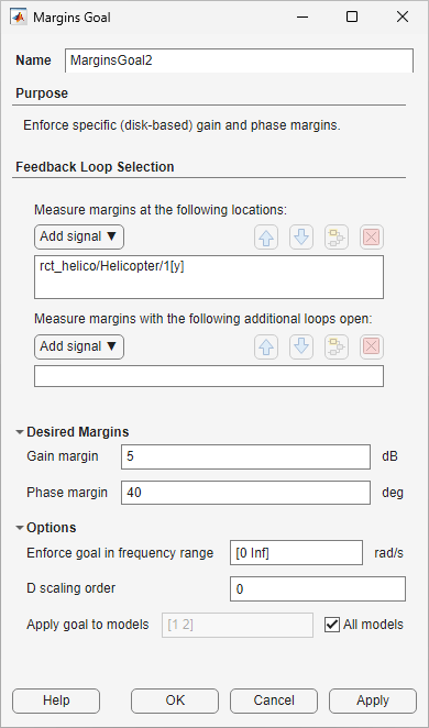 次に、目的の安定余裕要件に対する調整目標を作成します。この例では、プラントの入力 u とプラントの出力 y における多変数ゲイン余裕と位相余裕は、少なくとも 5 dB と 40 度でなければなりません。入力と出力の余裕制約に対して個別の調整目標を作成します。[新規目標] ドロップダウン リストで、[最小安定余裕] を選択します。[余裕目標] ダイアログ ボックスで、[次の位置の余裕を測定] に入力信号 u を追加します。また、ダイアログ ボックスの [目的の余裕] セクションにゲイン値 5 および位相値 40 を入力します。[OK] をクリックして入力安定余裕目標を保存します。