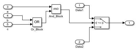 MATLAB Function ブロックで、"(a && (b | | c))" が true である場合は、信号 "Data1" が出力されます。それ以外の場合は、信号 "Data2" が出力されます。