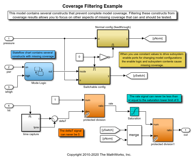 この例では、カバレッジ結果から一般的なパターンをフィルターで除外した例を含む slvnvdemo_covfilt モデルを使用します。