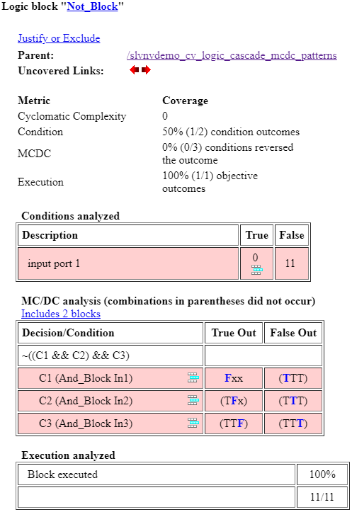 And_Block のカバレッジ レポートに 3 つの条件が表示され、各条件には 2 つの可能な結果があります。1 つの結果のみが満たされます。しかし、And_Block は MCDC 表を表示しません。これは、Simulink Coverage が And_Block をロジック カスケードの一部として識別しているために起こります。代わりに、レポート内の MCDC 行に、ロジック カスケードのルートを表すブロック Not_Block へのリンクがあります。リンク [Not_Block を参照してください] をクリックします。