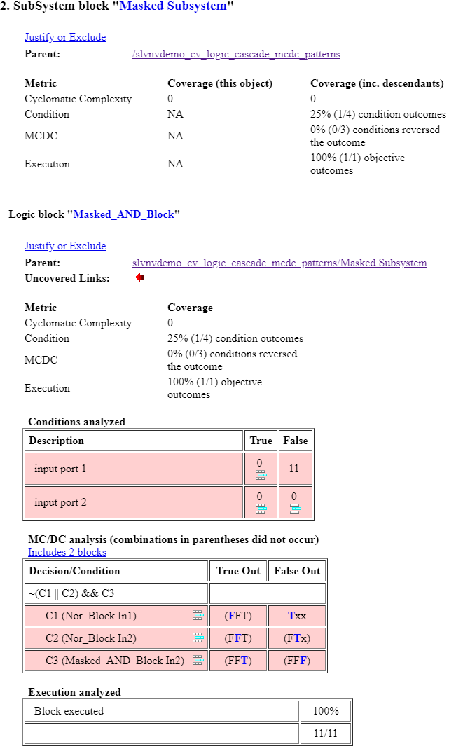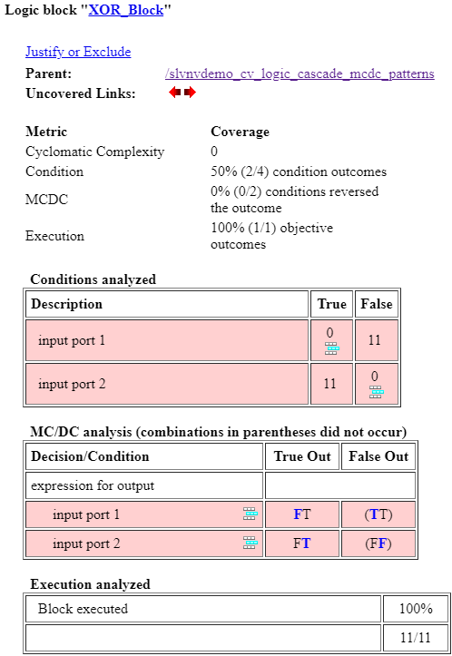 カバレッジ レポートにも、両方の解析表が表示されています。これは、カスケードされた MCDC 解析では XOR 演算および NXOR 演算はサポートされていないために発生します。結果として、Simulink Coverage はこれらのブロックの MCDC を個別に解析します。