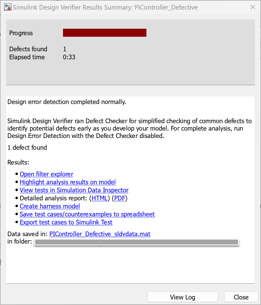 Defect Checker is most effective when applied to the specific component you are working on, ensuring you only address defects relevant to your current focus and avoid issues in unrelated components. This helps you to know what the defects are in the model and fix them before you integrate the component into a larger model. Defect Checker helps you to check the models throughout the development phase for common and critical design errors such as division by zero, integer overflow, dead logic, and array out of bounds.