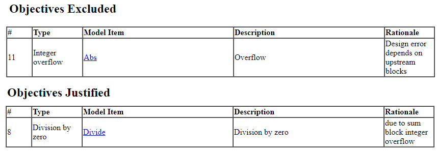 解析レポートを表示するには、[結果の概要] ウィンドウで [HTML] または [PDF] をクリックします。[設計エラー検出オブジェクティブのステータス] の章には、有効であり反証されたオブジェクティブの説明がリストされています。