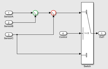 sldvexComplexInputs モデルには、センサー A、センサー B およびセンサー C の複素数入力および制御入力が含まれます。センサー A 入力とセンサー B 入力は、100 と等しい [出力の最大値] に制約されます。