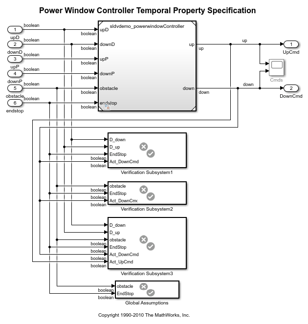 この例では、Simulink® Design Verifier™ の Temporal Operator ブロックを使用してパワー ウィンドウ コントローラー モデルの時相システム要件をモデル化し、プロパティ証明とテスト ケースの生成を行う方法を説明します。