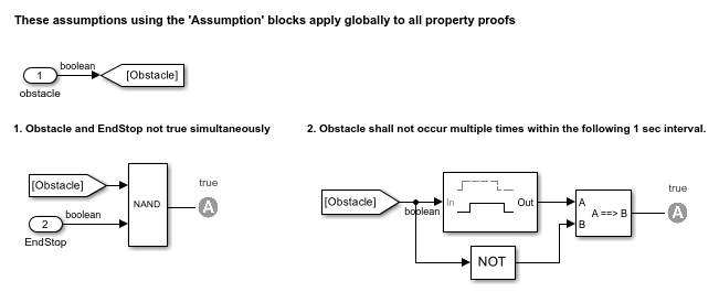 全体的な前提条件: パワー ウィンドウ コントローラーは開放型システムです。そのため、環境制御される入力 obstacle と endstop (ウィンドウ フレームの終端) が任意に発生します。環境を制約するには、コントローラー モデルに 2 つの全体的な前提条件を追加します。
