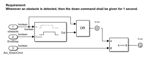 最後の Implies ブロックは、上記で構築した時相期間を使用して、この期間中の各タイム ステップでコントローラーの down コマンドが true であるかどうかをチェックします。