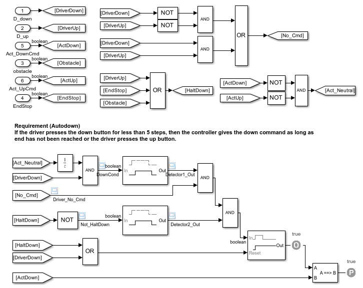 オートダウン機能では、down 信号は 1 秒 (5 タイム ステップ) より長く押すことはできません。したがって、down ボタンが押されてから 5 ステップに達する前に、DriverUp と DriverDown の両方が "true" になるか、両方が "false" になるようにする必要があります。この運転席 neutral と Detector 出力の AND を取ることにより、連続タイム ステップ数が 5 未満まで運転席の down を押すことができるという制約を強制します。