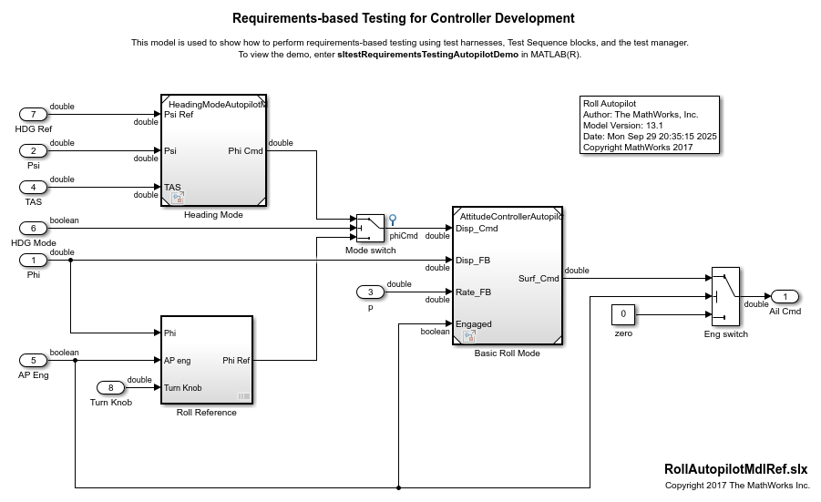 topModel = 'TestAndVerificationAutopilotExample'; rollModel = 'RollAutopilotMdlRef'; testHarness = 'RollReference_Requirement1_3'; testFile = 'AutopilotTestFile.mldatx'; reqDoc = 'RollAutopilotRequirements.txt';