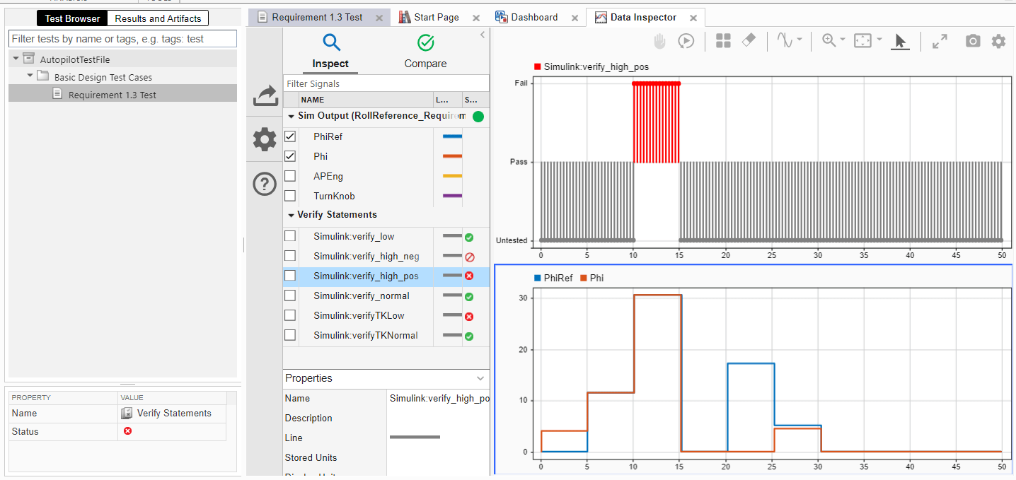 要件エディターを開いて、Roll Reference ブロックに関連付けられている要件を確認します。[テスト ブラウザー] ペインのツリーで [AutopilotTestFile] と [Basic Design Test Cases] を展開し、[Requirement 1.3 test] をクリックします。[Requirement 1.3 test] タブで、[要件] を展開します。いずれかの要件リンクをダブルクリックして要件エディターを開きます。要件を強調表示すると、[プロパティ] ペインの [説明] セクションにその詳細が表示されます。