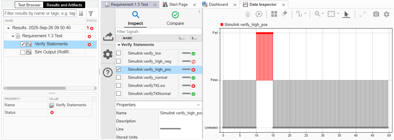 [データ インスペクター] タブの [検査] ペインで [Simulink: verify_high_pos] を選択します。プロットに、ステートメントがいつ失敗したのかが示されています。