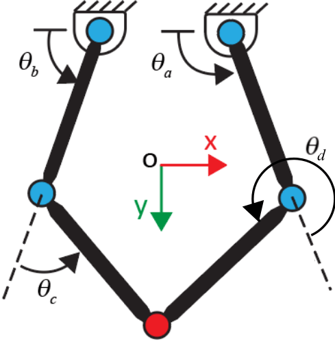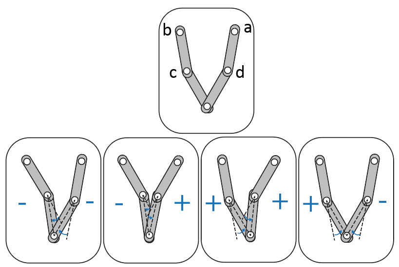 5 節ロボットにはコンフィギュレーション空間の領域として --、-+、++、+- の 4 つがあります。図に示すとおり、それぞれの符号は、対応する近位リンクと遠位リンク間のオフセット角の符号を表します。能動回転ジョイント a および b はモーターによって直接制御され、受動回転ジョイント c および d は近位リンクと遠位リンクを接続します。