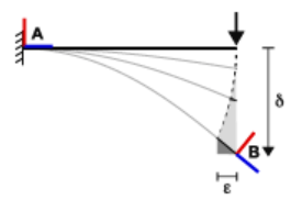 これらの仮定のうち 1 つ以上が満たされていない場合は、結果が不正確になることがあります。たとえば、次の図で、横断的な点荷重を受ける片持ちビームは、たわみ変形 "δ" が大きいと結果が不正確になります。たわんでいる間、ビームの自由端は、真の物理パス (点線の軌跡) に従うのではなく、下方向に垂直に動きます。誤差 "ε" は、"δ" の増加に従って増加します。