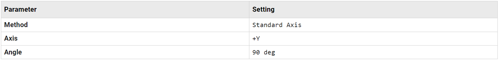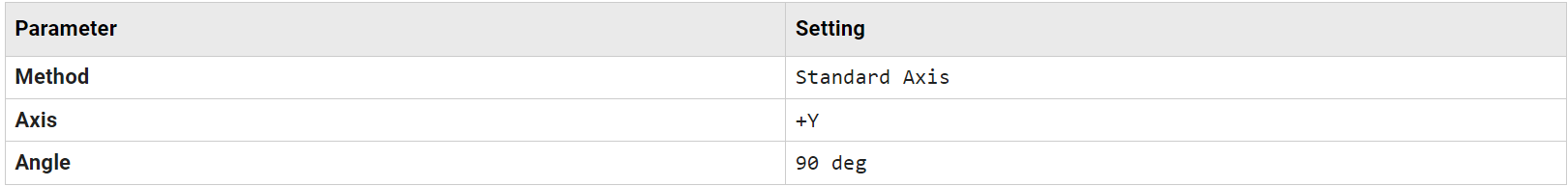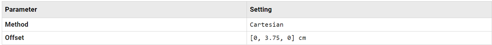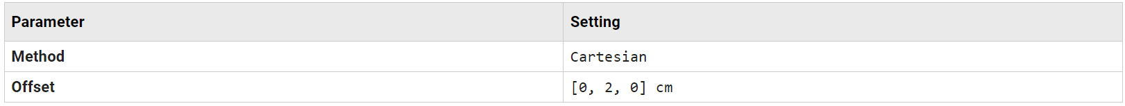 ラックの並進軸はピニオンの回転軸に対して直角です。ピニオンの基準座標系は、ワールド座標系に対し、直交座標で [0, 2, 0] cm オフセットした位置にあります。ラックの基準座標系は、ワールド座標系の "y" 軸の正方向に対し 90 deg の角度をなす位置にあります。