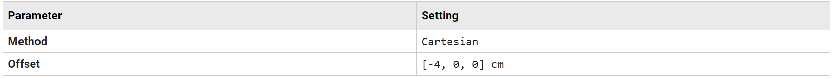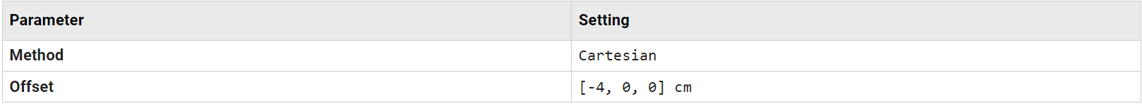 平歯車の回転軸は互いに平行です。小さい平歯車の基準座標系は、ワールド座標系に対し、直交座標で [-4, 0, 0] cm オフセットした位置にあります。大きい平歯車の基準座標系は、これもワールド座標系に対し、[-8, 0, 0] cm オフセットした位置にあります。
