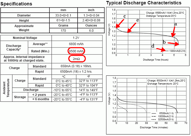 次の図は、Panasonic NiMH-HHR650D バッテリーのデータ シートから抽出した詳細なパラメーターを示したものです。