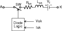 Diode ブロックは、スイッチと直列に接続されている抵抗、インダクタ、および DC 電圧源によってシミュレートされます。スイッチの動作は、電圧 Vak と電流 Iak によって制御されます。