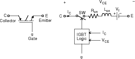 IGBT は、コレクター-エミッター電圧が正で Vf より大きく、ゲート入力に正の信号が印加されている (g > 0) 場合にオンになります。コレクター-エミッター電圧が正でゲート入力に 0 信号が印加されている (g = 0) 場合にオフになります。