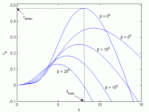 係数 c1 ~ c6 は次のとおりです。c1 = 0.5176、c2 = 116、c3 = 0.4、c4 = 5、c5 = 21、および c6 = 0.0068 です。ピッチ角 β の各種値に対する cp-λ 特性を以下に示します。cp の最大値 (cpmax= 0.48) は、β = 0 度および λ = 8.1 の場合に得られます。λ のこの特定の値は、ノミナル値 (λ_nom) として定義されます。