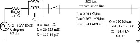 次の図に示す回路は、300 km の伝送線路に電力を供給する電力システムを表しています。この線路は、その受電端でインダクタにより補償されます。回路ブレーカーにより、線路への電圧の印加を制御できます。単純化するために、3 相のうちの 1 相だけを示します。図に示すパラメーターは、735 kV の電力システムに標準的なものです。
