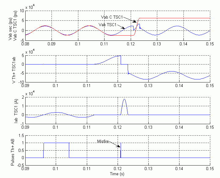 TSC のサイリスタのスイッチがオフになる度に、電圧は TSC のコンデンサに吸収されます。Signals & Scope サブシステム内で TSC1 Misfiring と名付けられた Scope ブロックを見る場合、A-B 相に対する、TSC1 の線間電圧 (以下の図の Vab sec(pu)) と TSC1 の線間電流 (以下の図の Iab TSC1(A)) を観測できます。正方向のサイリスタ (正の電流を流すサイリスタ) にかかる線間電圧は、以下の図の VTh + TSC1ab に表示され、このサイリスタに送られるスイッチングのパルス信号は、以下の図の Pulses Th+AB に表示されます。正方向のサイリスタは、正常な点弧作用を行う場合は、サイリスタ バルブ電圧が最小で負方向の TSC の線間電圧の絶対値が最大となるときに点弧することがわかります。
