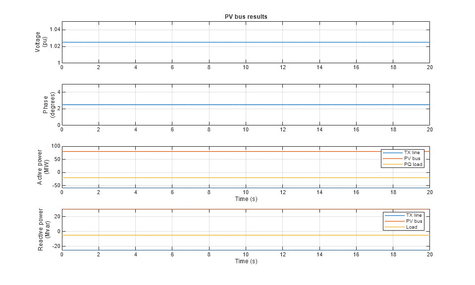 2 つの母線ブロックには、電力潮流の初期化の結果の概要を示すタグが付けられています。これらのタグは、モデルのシミュレーション後、直ちに更新されます。タグの 1 行目から、2 つの電源の端子において要求された電圧が守られていることがわかります。タグの 2 行目は、Busbar2 のほうが Busbar1 より 2.51 度高いことを示しています。これは Busbar2 から Busbar1 へ、実質の電力潮流があることを反映しています。3 行目と 4 行目はそれぞれ、有効電力と無効電力を示しています。たとえば、Busbar2 タグの 3 行目は、60 MW の有効電力が母線から伝送線路へ流れ、80 MW の有効電力が PV 母線によって供給され、20 MW の有効電力が PQ 負荷に供給されていることを示しています。