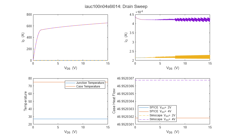 MOSFETFromSPICEResults スクリプトは関数 ee_convertedMosfetValidation を呼び出して、いくつかの標準的な特性 (Id 対 Vgs、Id 対 Vds、Qiss/ゲート電荷、Qoss/出力電荷、ブレークダウン電圧など) を生成します。