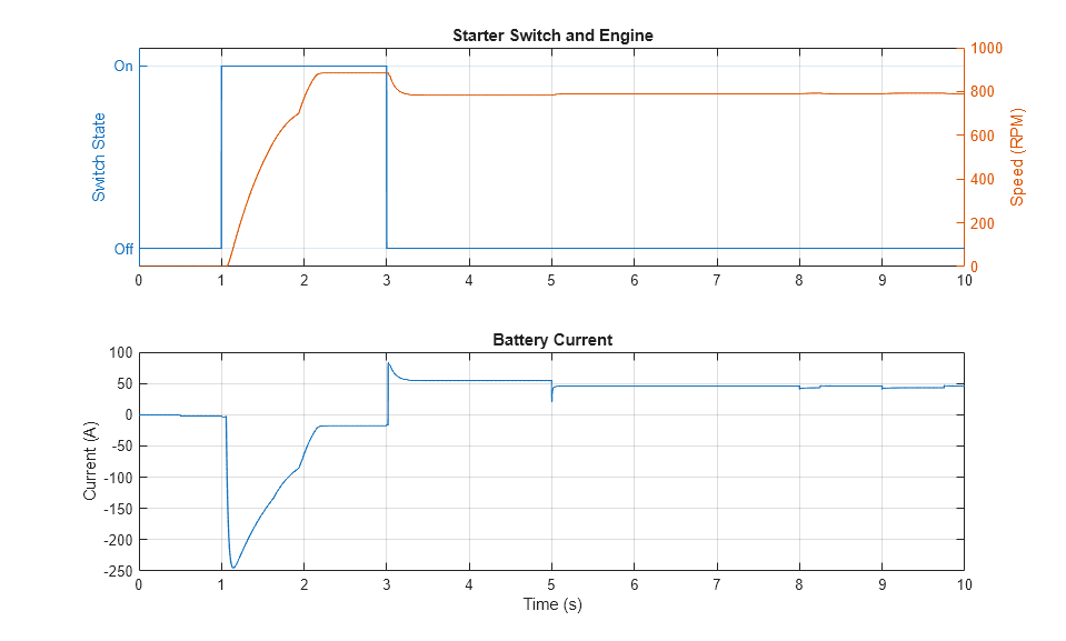 以下のプロットは、自動車の電気回路網の起動シーケンスを示しています。スターター モーターがオンになると、バッテリーからエンジンを始動するための電流が流れます。ライトや他の電気負荷がオンまたはオフになると、バッテリーから流れる電流が変化します。