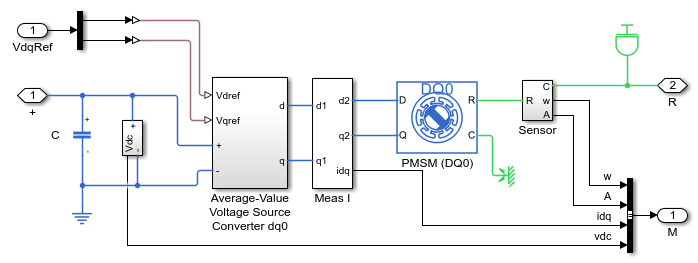 この例では、単純化された車軸駆動電気自動車を推進する埋込永久磁石同期機 (IPMSM) をモデル化します。この例では、回転子の主磁束方向と直交方向 (DQ) の基準座標系でトルクを制御してシミュレーションします。IPMSM は、モーター モードと発電機モードの両方で動作します。車両のトランスミッションと差動装置は、ギア減速比の固定されたモデルによって実装されています。Vehicle Controller サブシステムは、運転者の入力を、関連するトルク指令に変換します。Drive Controller サブシステムは IPMSM のトルクを制御します。制御アルゴリズムは連続時間で実装されています。このモデルをより高速にシミュレーションするために、この例では可変ステップ ソルバーを使用します。Scopes サブシステムには、シミュレーション結果を確認できるスコープが含まれています。