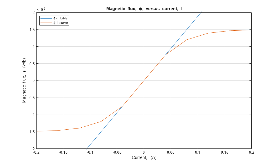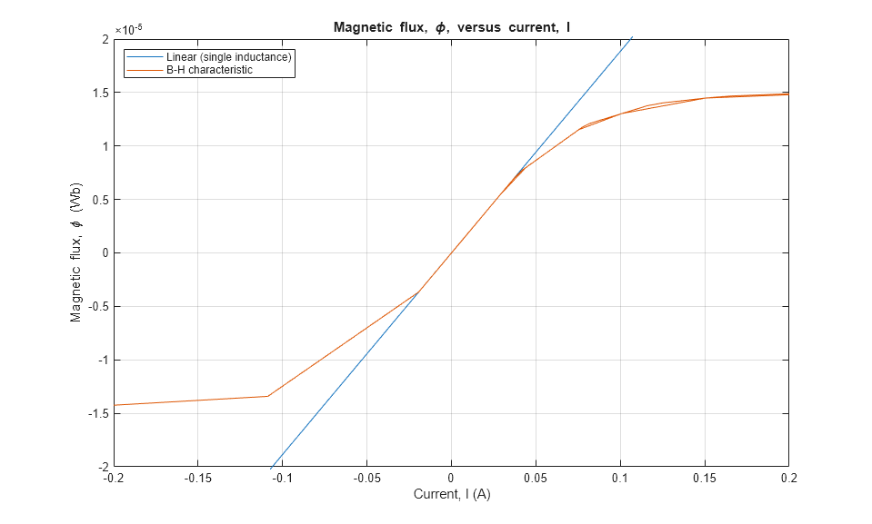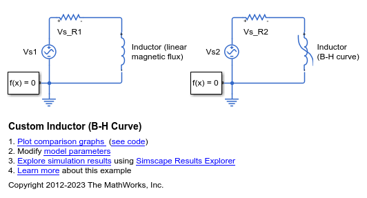 この例では、線形および非線形インダクタの挙動を比較します。基本パラメーター値から開始して、線形および非線形表現のパラメーターが導出されます。次に、これらのパラメーターが Simscape™ モデルで使用され、シミュレーション出力が比較されます。
