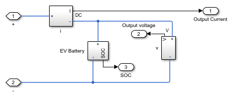 EV Battery Pack は、直列接続されたバッテリー セルと、バッテリーの端子電圧および出力電流を測定するセンサーをモデル化します。
