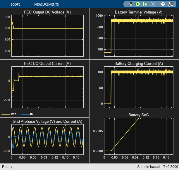 以下のプロットは、DC 母線の電圧と電流、バッテリー端子電圧、および充電電流を示しています。