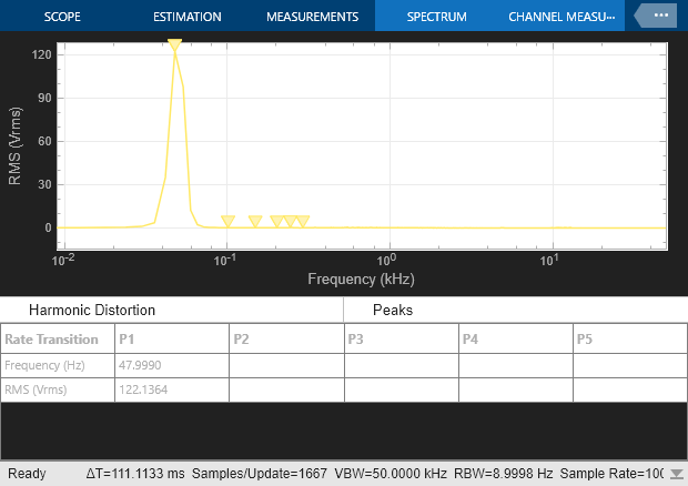 Filter & AC Measurements。線電流の高調波をフィルター処理し、三相電源電圧と線電流を測定します。