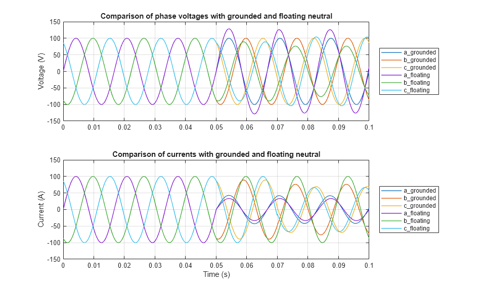 0.05 秒までは、中性点接地と中性点非接地の条件で相電圧と相電流に違いはありません。0.05 秒の時点で、負荷は不平衡になり、負荷に流れる電流はどちらの条件においても変化します。ただし、中性点接地の場合の相電圧は、シミュレーション全体を通じて一定に維持されています。これは、負荷が効果的に接地され、三相負荷の不平衡の影響を受けないためです。